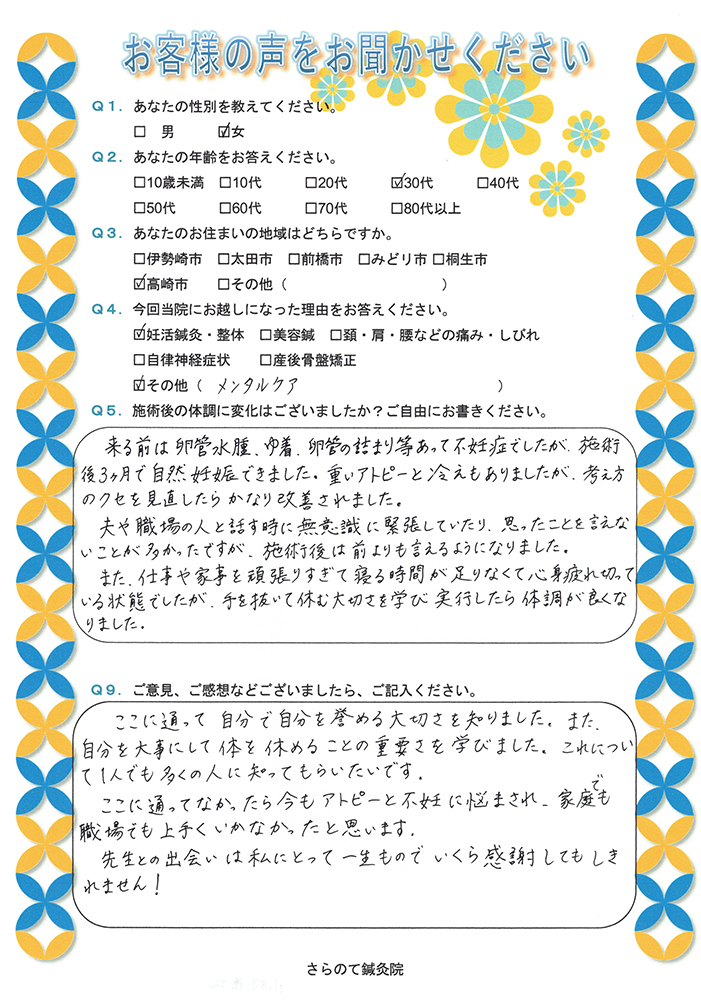 来る前は卵管水腫、ゆ着、卵管の詰まり等あって不妊症でしたが、施術後3ヶ月で自然妊娠できました。重いアトピーと冷えもありましたが、考え方のクセを見直したらかなり改善されました。