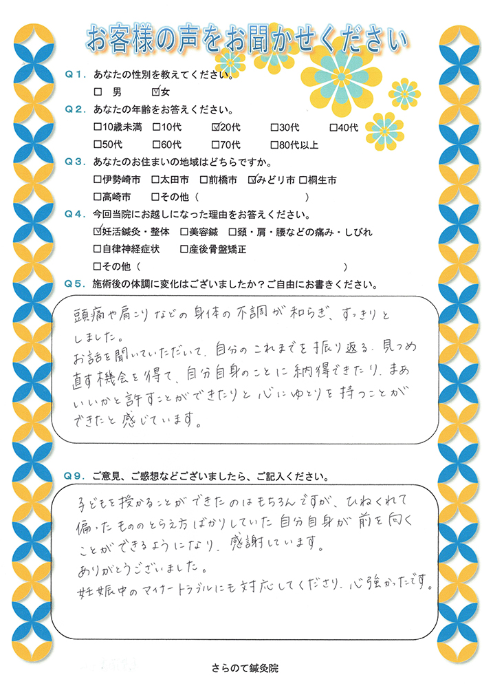 体外受精を試みた時、成熟した卵ができず、体内の血流が悪いことに気がつきました。血流を良くするためさらのて鍼灸院への通院を始めたところ、成熟した卵を取ることができ、また妊娠に至ることができました。その他施術をしてもらうことで身体の血流がよくなり、身体が軽くなったことはもちろんですが、風邪をひきにくくなるなど免疫力も高まったと実感しています。