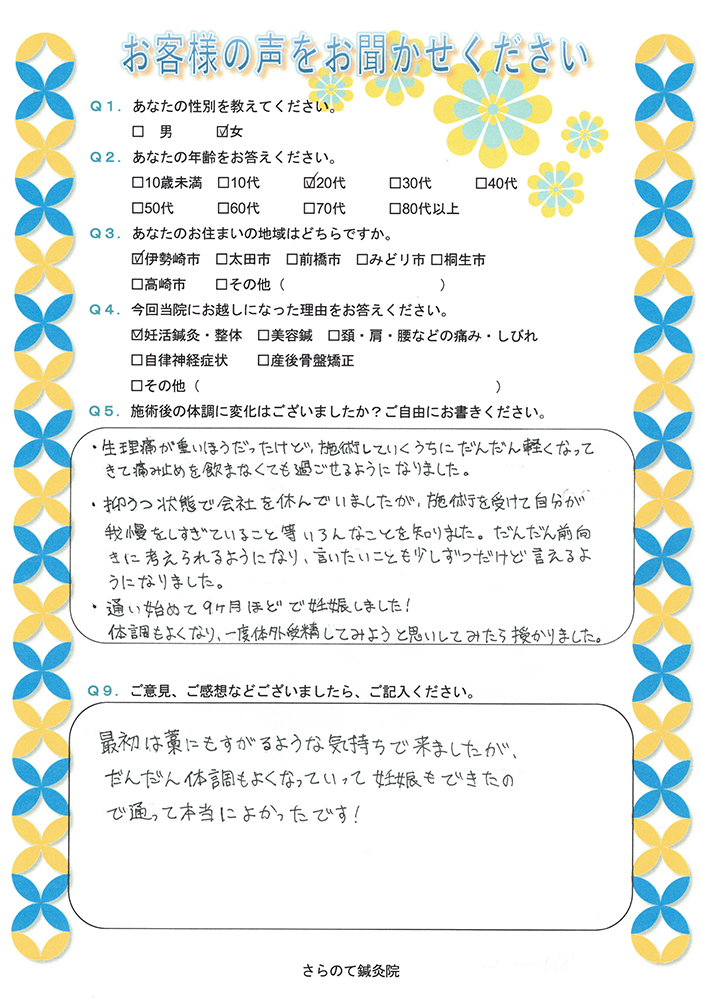 婦人科に通院してもサプリメントすら勧められなかったのですが、さらのてでは体質改善について豊富な知識で毎回自分に合ったアドバイスをして下さり、ありがたかったです。