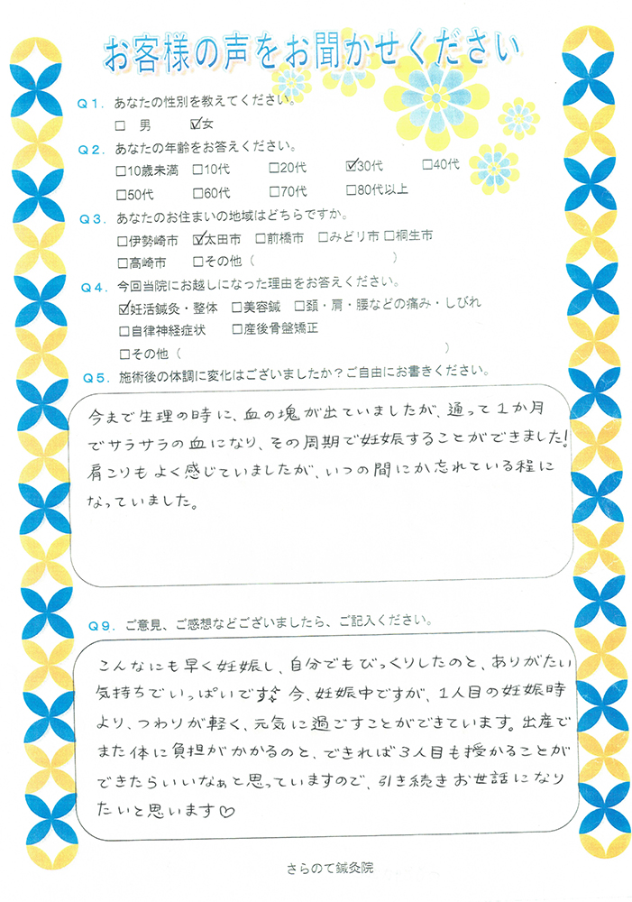 今まで生理の時に、血の塊が出ていましたが、通って1ヶ月でサラサラの血になり、その周期で妊娠することができました!