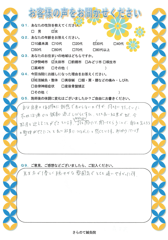 自分自身の体調に鈍感でわからないのですが、同時に行っていた不妊治療では鍼灸に通ってしばらくすると、とても良い結果が出て、今臨月を迎えることができています。施術を通して話を聞いたり、聞いてもらうことで自分の気持ちの整理ができたことも良い結果につながったと感じています。ありがとうございます。
